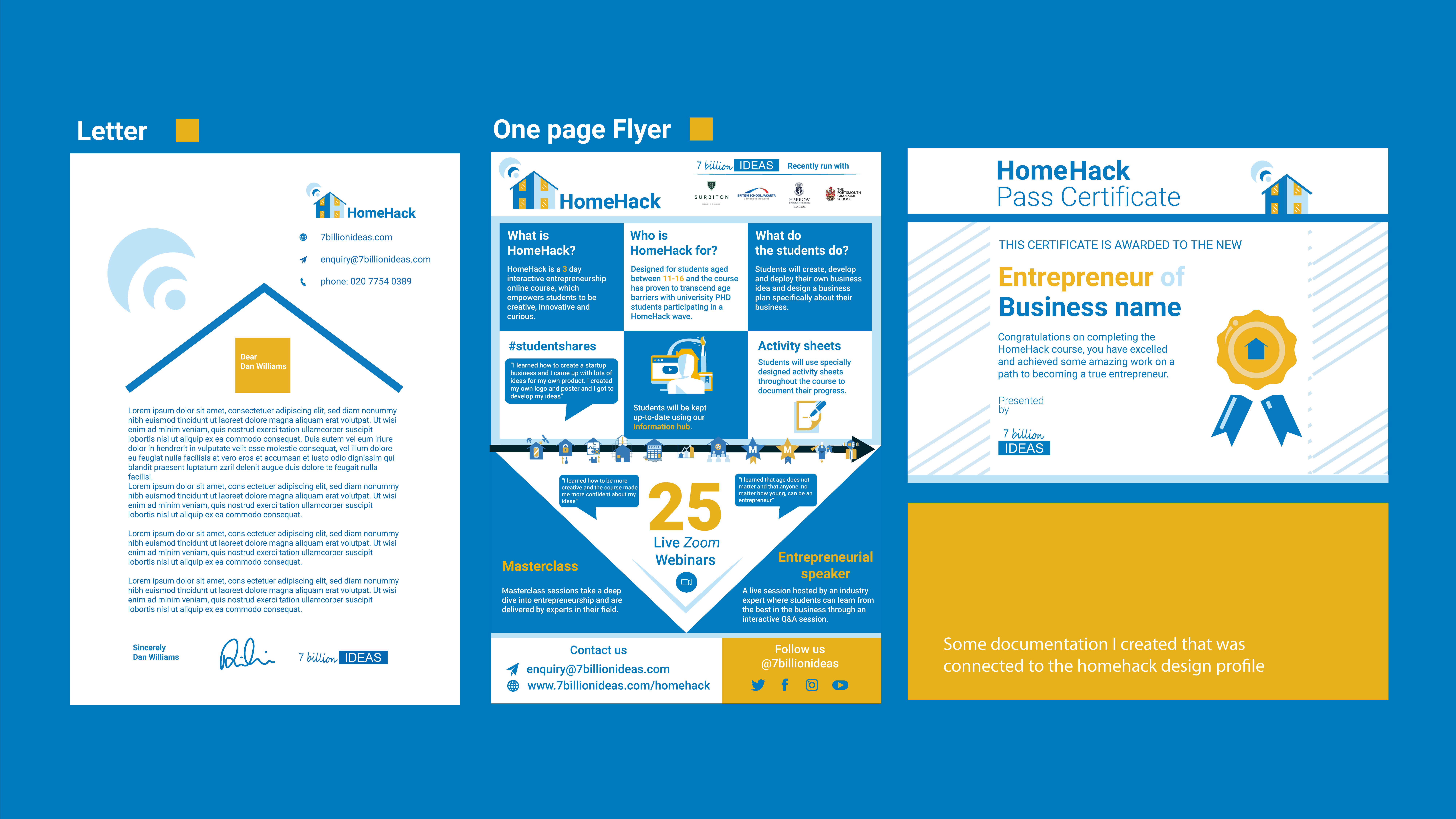 Developed the full visual identity for HomeHack, a live interactive course delivered globally to children. Created the logo, colour palette, and branding, and designed presentation decks used throughout the sessions to engage participants worldwide.